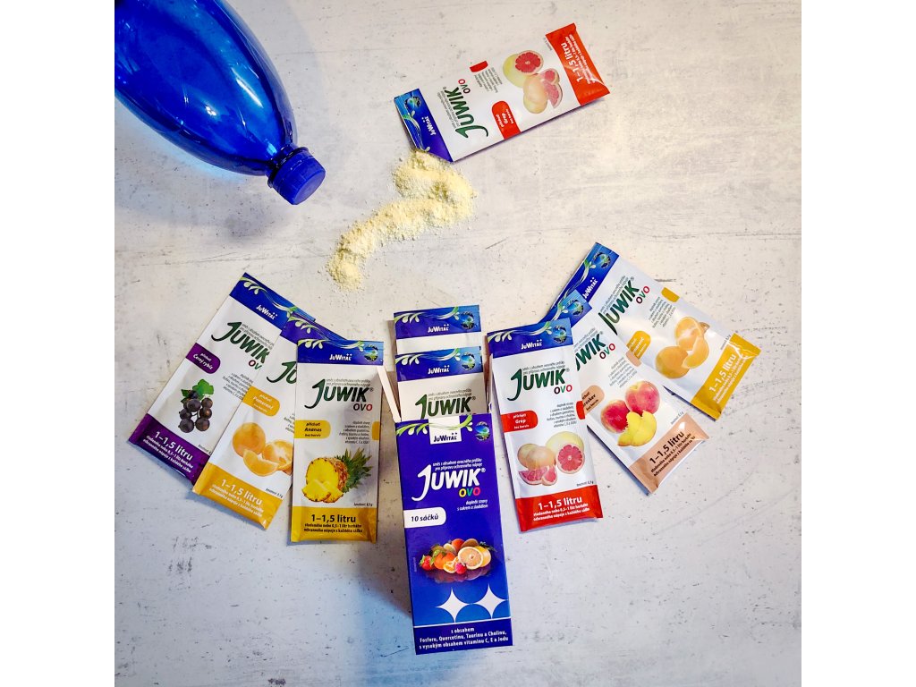 Složení: sacharóza; kyselina: kyselina citronová; regulátor kyselosti: fosforečnany draselné; mléčnan vápenatý; aroma; protispékavá látka: oxid křemičitý, vitamin C (L-askorbová kyselina); uhličitan hořečnatý; regulátor kyselosti: u hličitany sodné; ovocný prášek 1,1 %; sladidlo: acesulfam K; cholin; taurin; vitamin E (DL-α-tokoferyl-acetát); quercetin; JUWIM® (směs esenciálních aminokyselin, oligopeptidů, RNA, DNA); jodid draselný